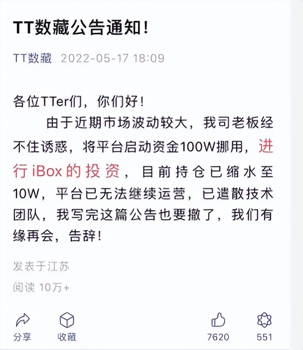 但危機並未過去。因為率先開通了二級市場,iBox一直背負著“惡性炒作”的名聲,更有大學生借款入市被套的傳聞。5月17日,TT數藏通過公眾號發佈公告,稱公司老闆經不住誘惑,將平台啟動資金100萬元挪用進行iBox投資,持倉縮水至10萬元後平台無法繼續運營,公司已遣散技術團隊。